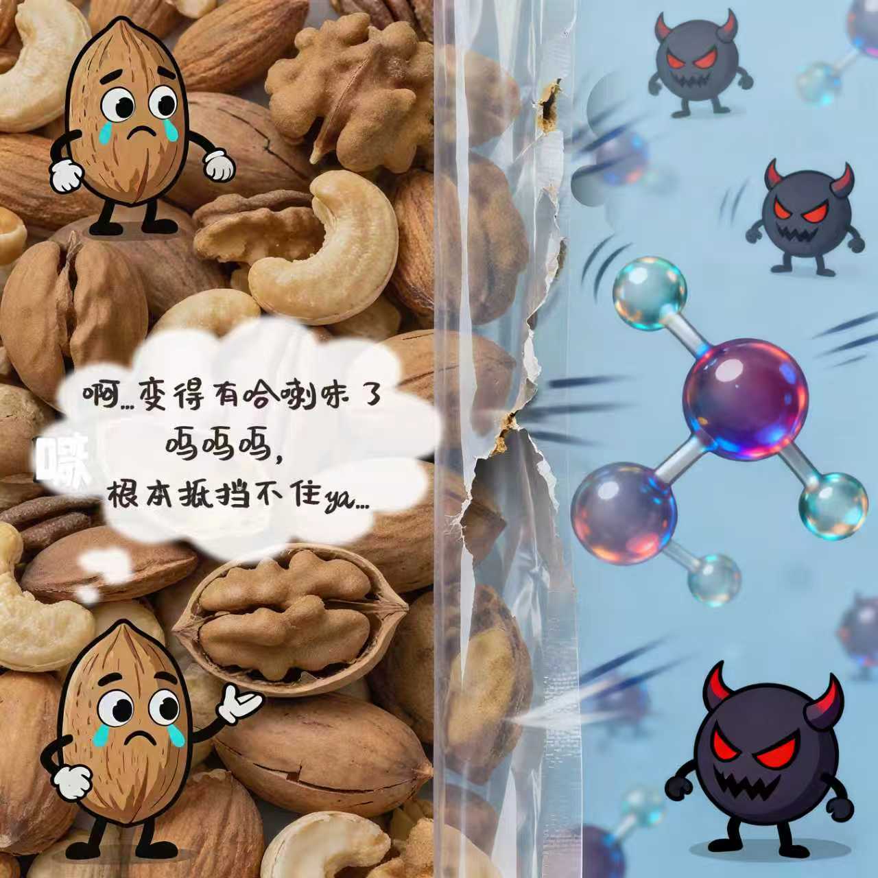堅果就像一個內(nèi)在豐盈的“營養(yǎng)寶庫”,富含不飽和脂肪酸和油脂。但這些營養(yǎng)成分非常嬌貴,一旦與空氣中的氧氣接觸,就會發(fā)生一場化學(xué)反應(yīng)——氧化酸敗。
